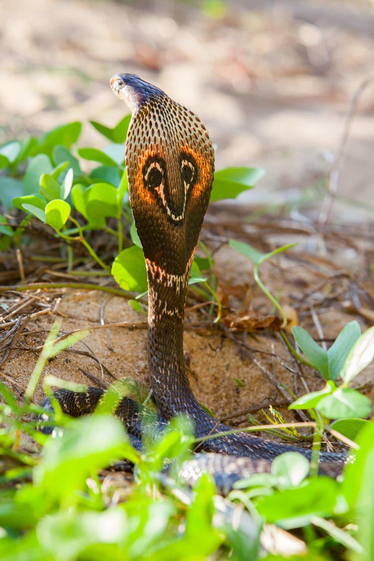 There are about 11 species of Cobras living in Southeast Asia. The Asian Cobra (Spectacled Cobra) is considered the most dangerous snake in the world. It is not the most poisonous one, but the one that bites the most often. Cobras release significant amounts of deadly neurotoxic venom into their victim, resulting in necrosis and respiratory collapse. This venom, while not the most toxic, does not respond very well to antivenom. It will still damage tissue around the bite. Spitting Cobras, like the IndoChinese Spitting Cobra or Sumatran Spitting Cobra, can accurately spit powerful neurotoxic venom into the eyes of their victims across 3 m. This defense mechanism can cause temporary blindness (or permanent blindness if not treated).Cobras have a characteristic patterned hood on the backside of their head, which they only open when feeling threatened.