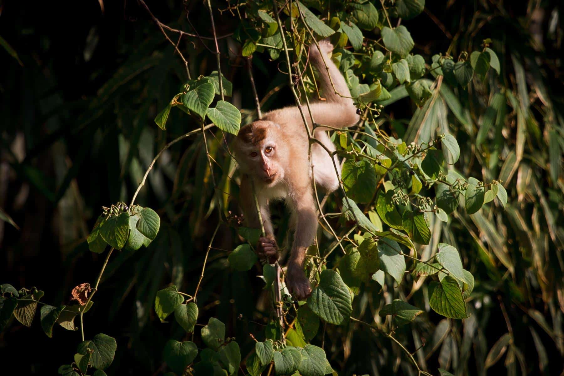 Macaques are the most widespread primates on the planet. There are 23 species of macaques and their habitat ranges from Japan to mainland Asia to Northern Africa and Southern Europe. The most common species of macaque seen in Khao Sok national park are the stump‐tailed macaques and the long‐tailed macaques. Even though some of the species feature a tail and some don’t, they are all classified as monkeys and not as apes. Macaques live in groups called troops and they have a very complex social structure consisting of dominant and submissive individuals.