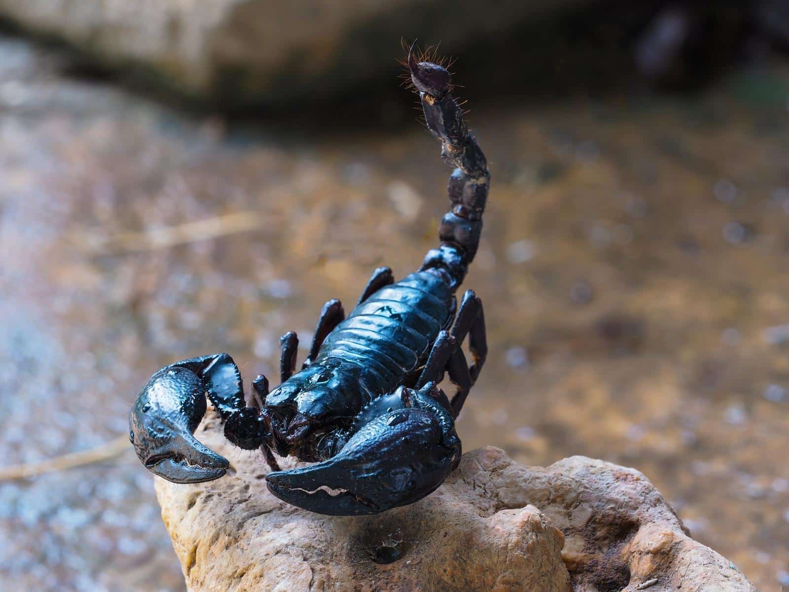Scorpions are actually classified as Arachnids (spiders). There are currently 18 known species/sub­ species of scorpions in Thailand. Scorpions have a large pair of powerful pincers at the front end, with a long poison tipped tail. Scorpions are usually black or dark green in color and 10 to 17 cm long with females being larger than males. Scorpion poison is usually not much different to a bee or wasp sting;