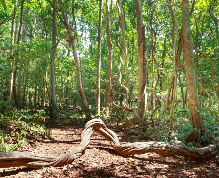 There are about 2500 species of lianas in the world, which all come in various shapes and sizes. The name liana is not a taxonomic group, but a group of plants which grow in a particular manner. There are two major functional groups, those which start off life rooted in the soil andborrow other trees to gain height, and those which start off life in the canopy and drop roots down to the ground. Neither type is a parasite on the trees they climb; they simply use their surroundings for physical support. However, trees can grow faster without lianas, because they have more exposure to sunlight. In some places lianas account for 40 percent of the canopy cover!
